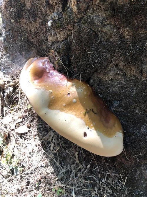 3) Laetiporus gilbertsonii: This polypore mushroom is brightly colored orange on top and yellow on the bottom, which explains it common name of Sulfur Shelf. This species is often a mushroom novices get right due to stand out appearance and it fruits before the first fall rains (august to october generally). So some simple basics of identifying this speices: they grow on oaks and eucalyptus mainly, the fruiting bodies have a shelf like habit with each shelf being 1-3 inches thick, Orange topside, yellow underside (fading to white with age), growing anywhere along the trunk of the tree. This species causes brown heart rot, which severely degrades the structural integrity of the wood it lives on. In my personal experience of 15+ documenting mushrooms in El Dorado county, this species is the most likely to led to structural failure of seemingly healthy trees. This is due to the fact that degrades the heartwood well, leaving hollow centers, which many trees can tolerate, but gets degrading into the sapwood until there is very little holding wood left.
